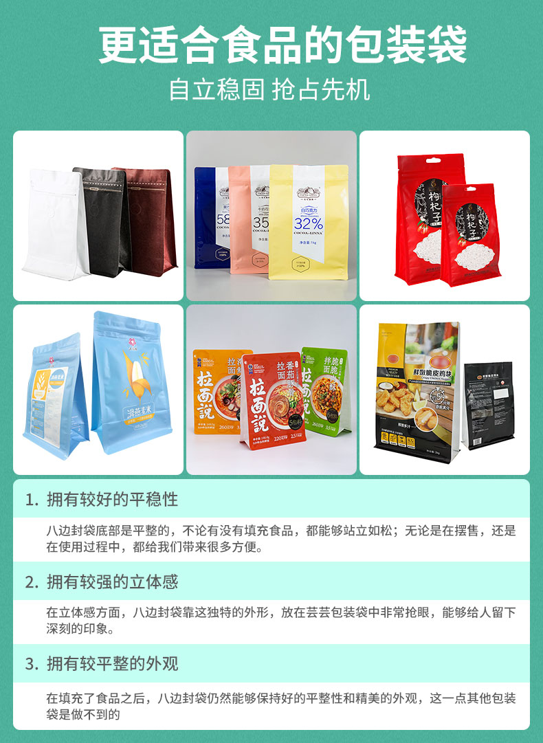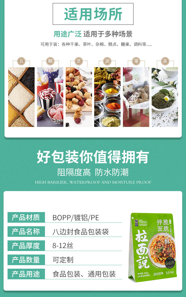 产品名称:八边封食品安博anbo中国袋 产品材质:PET/AL/PE BOPP/VMPET/PE 厚度推荐:8丝-10丝产品名称:八边封食品安博anbo中国袋